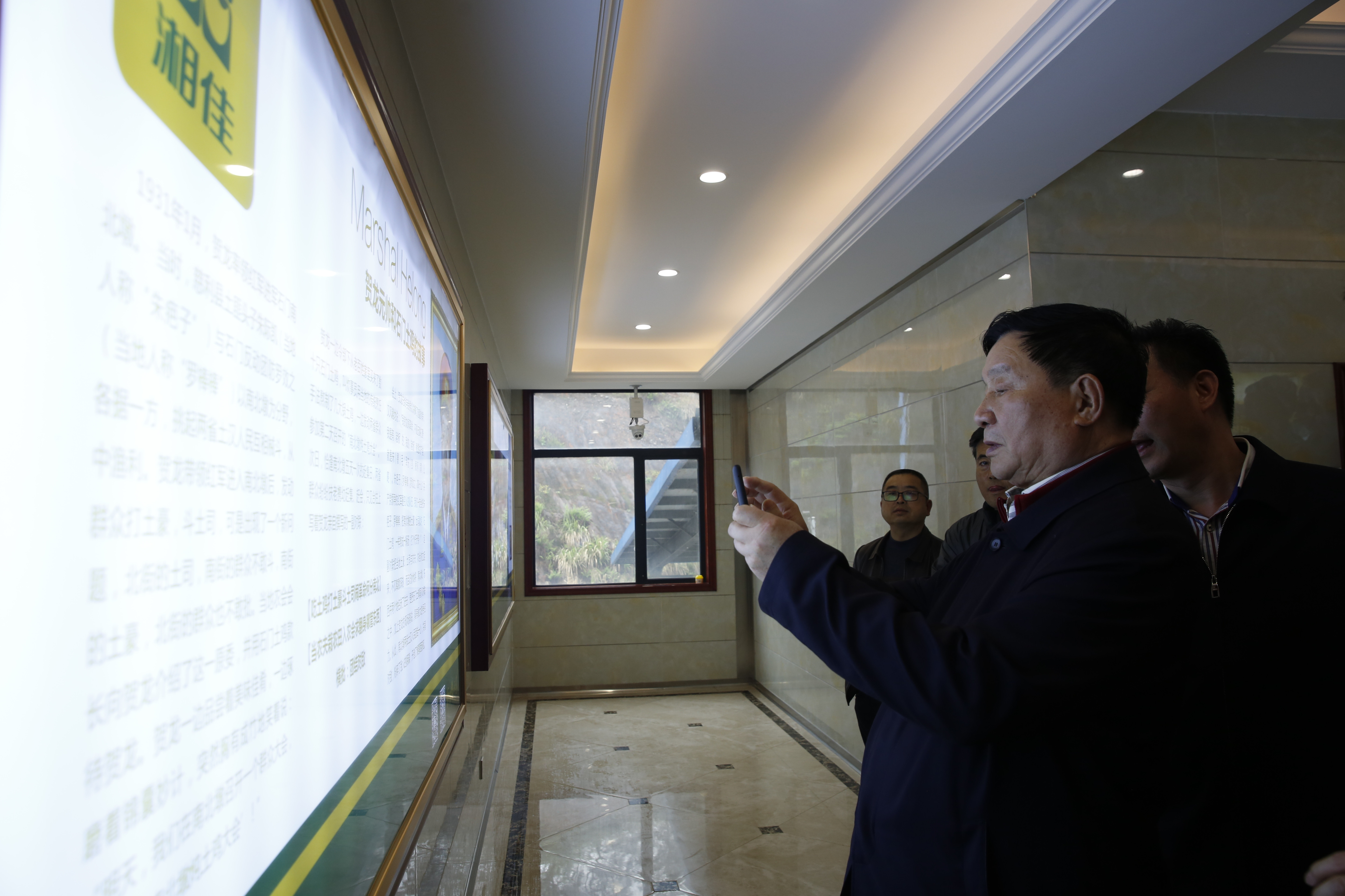 參觀途中,講解員介紹到,湘佳現(xiàn)代農(nóng)業(yè)利用雞糞生產(chǎn)加工有機(jī)肥,廣泛施用于水果、蔬菜、茶葉、水稻、油茶、中藥材、花木等作物栽培,有效地改良了土壤結(jié)構(gòu),提高了農(nóng)作物品質(zhì),受到了各地農(nóng)民的喜歡。 看到賀龍與石門土雞的故事將軍連拍了幾張照片… 參觀途中,文化長(zhǎng)廊里的一扇櫥窗,吸引了唐天標(biāo)的目光,那扇櫥窗展示的是賀龍?jiān)獛浐褪T土雞的故事—— 1931年,賀龍率領(lǐng)紅軍進(jìn)駐湘鄂邊界南北墩,當(dāng)?shù)氐耐了尽⑼梁捞羝饍墒“傩招刀罚瑥闹袧O利。為了發(fā)動(dòng)兩省邊界的老百姓?qǐng)F(tuán)結(jié)起來(lái),打土豪分田地,賀龍別出心裁,利用趕集日,搞了一場(chǎng)“南北墩燉土雞大會(huì)”,還親自寫了一副對(duì)聯(lián)—— 吃土雞打土豪斗土司鬧革命何分南北 當(dāng)農(nóng)夫栽農(nóng)田入農(nóng)會(huì)求翻身哪管東西 橫批:團(tuán)結(jié)對(duì)敵 唐天標(biāo)仔細(xì)地欣賞著這副對(duì)聯(lián),連聲說(shuō)“好故事!好對(duì)子!”并拿起手機(jī),連拍了幾張照片,留作紀(jì)念。