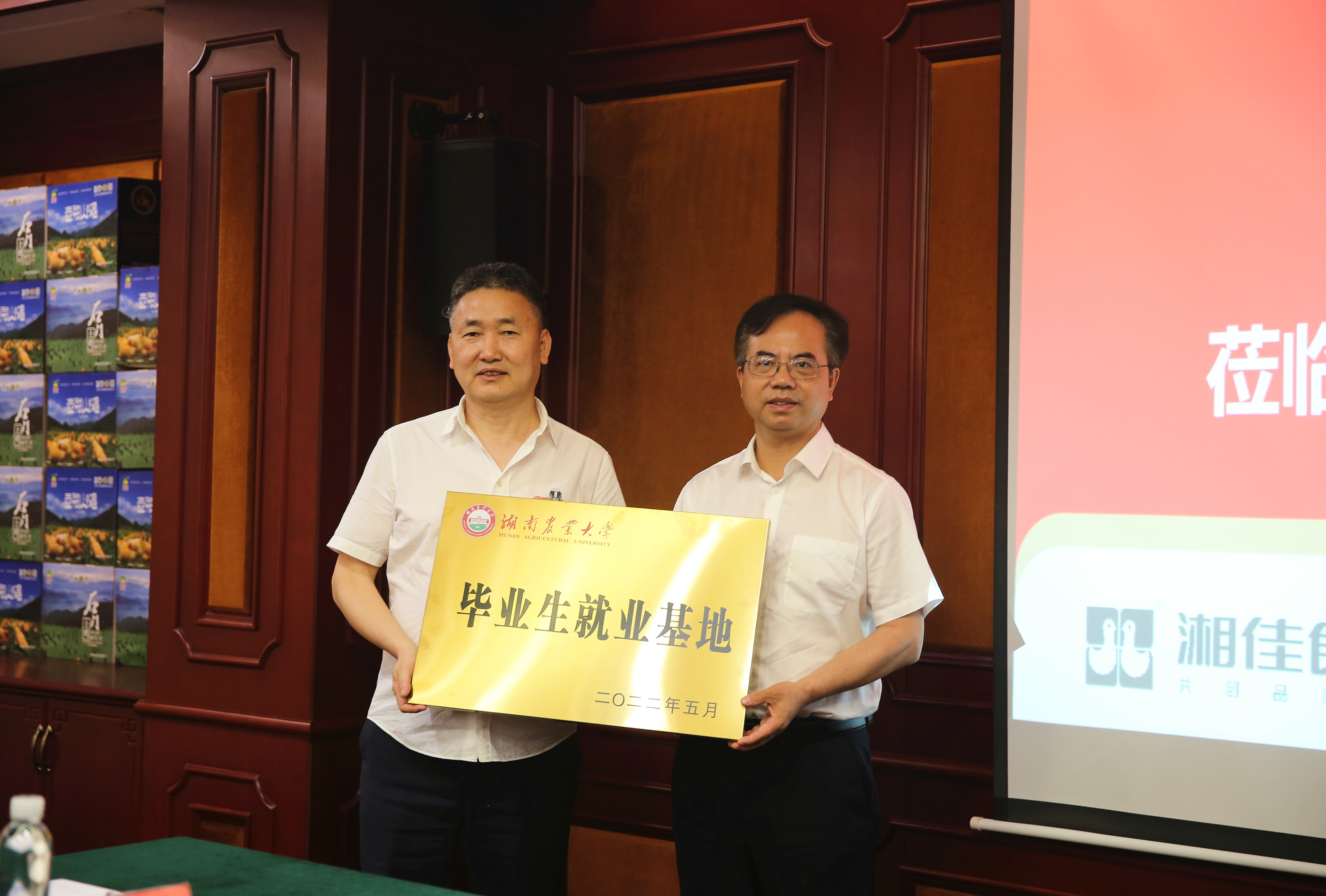 5月7日,湖南農業大學黨委書記陳弘、黨政辦主任王永昌,動物科技學院院長賀喜,動物科技學院黨委書記王奎武、動物醫學院院長鄭曉峰、動物醫學院黨委書記孫志良、新農村發展研究院副院長李毅來到湘佳股份,進行訪企拓崗調研和參加“畢業生就業基地”授牌儀式。